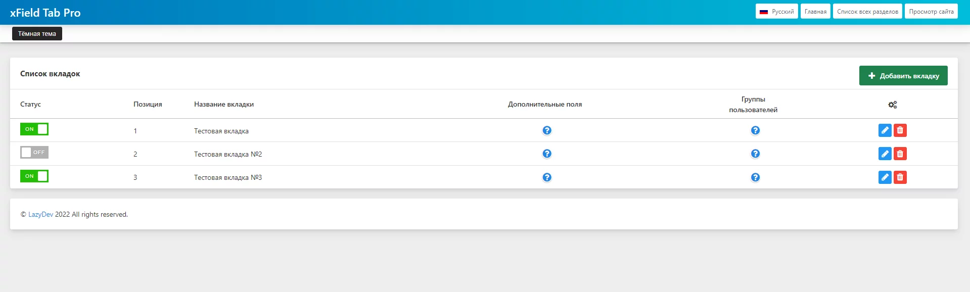 Возможность определять, какие группы пользователей будут иметь доступ к каждой вкладке. - Лёгкое включение и отключение вкладок: