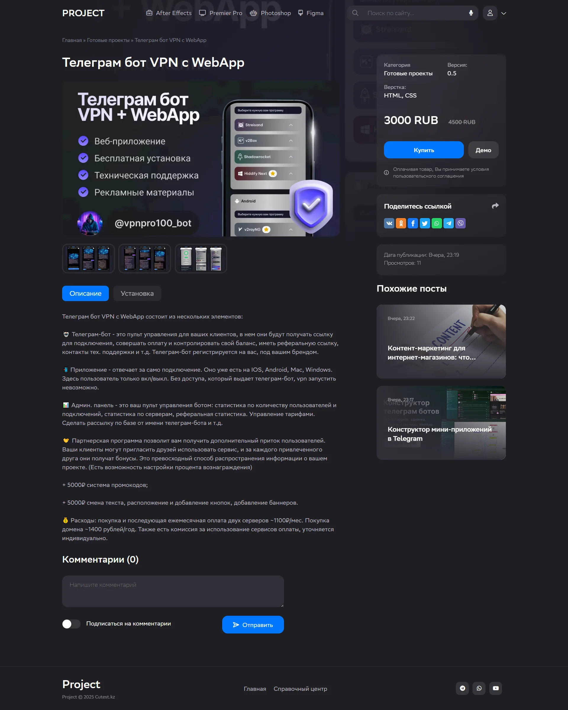 Решение идеально подходит для создания маркетплейсов скриптов, шаблонов, телеграм-ботов и другого программного обеспечения, предлагая профессиональную витрину для презентации продуктов. Гибкость шаблона позволяет использовать его как полноценный интернет-магазин с каталогом товаров и системой покупок, так и в качестве блога для продвижения собственных проектов и публикации новостей разработки.