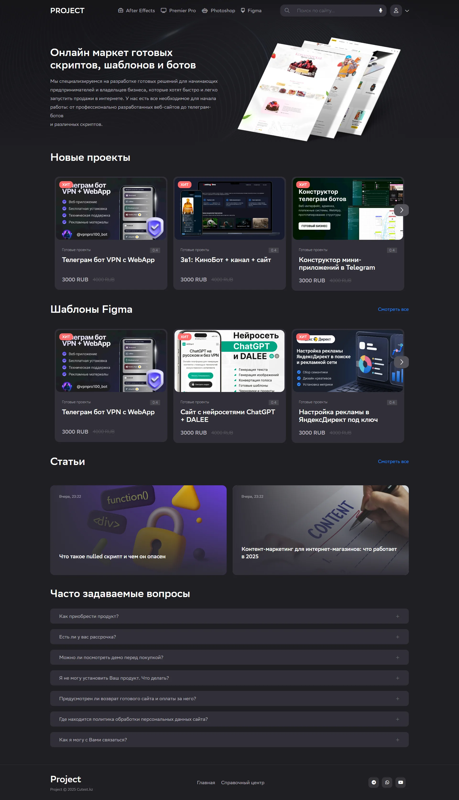 Адаптивная вёрстка обеспечивает корректное отображение на любых устройствах, а продуманная структура упрощает навигацию для покупателей. С Project вы получаете готовое решение для запуска торговой площадки цифровых товаров: лаконичное, функциональное и ориентированное на конверсию в продажу.